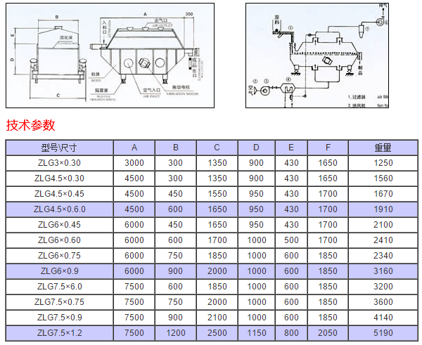 物料自進(jìn)料口進(jìn)入機(jī)內(nèi),在振動(dòng)力作用下,物料沿水平流化床拋擲,向前連續(xù)運(yùn)動(dòng),熱風(fēng)向上穿過流化床同濕物料換熱后,濕空氣經(jīng)旋風(fēng)分離器除塵后由排風(fēng)口排出,干燥物料由排料口排出。